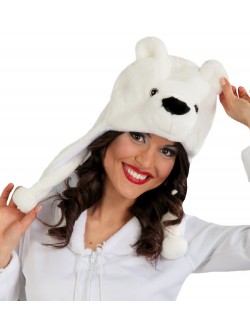 Caciula Urs Polar pentru adulti, din blanita sinterica alba, model peruvian cu ciucuri la capat.