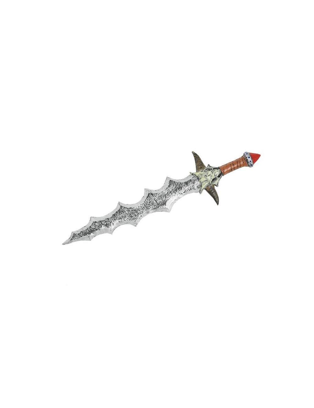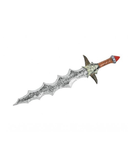Sabie zimtata, argintie, lungime 80 cm, sabie usoara, din poliuretan, cu lama zimtata, garda in forma de craniu cu coarne, lunga de 80 cm.
