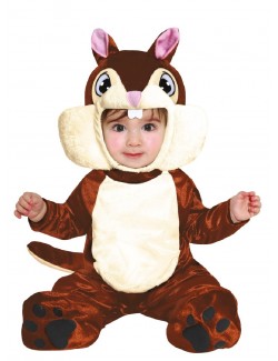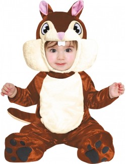 Costum Veverita, bebelusi 12/18 si 18/24 luni, alcatuit din salopeta din plus, gluga detasabila cu forma unui cap de veverita, botosei si coada detasabila. Material:100% poliester.