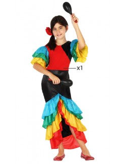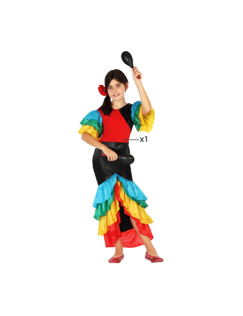 Rochie Dansatoare Rumba, pentru fete, din lycra neagru-rosu, cu volane multicolore din tafta colorata, material 100% poliester.