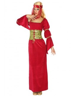 Costum medieval pentru femei, contine: Accesoriu pentru cap si Rochie rosie, din catifea subtire, cu centura aurie, accesorizate cu garnitura aurie, material 100% poliester.