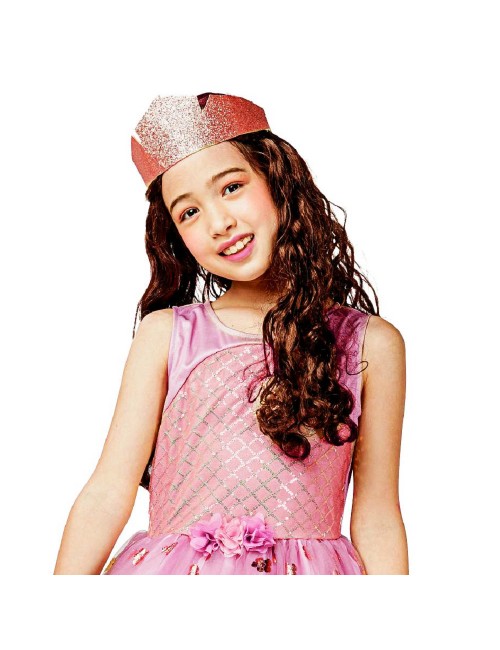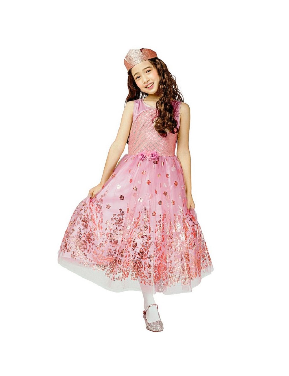 Costum Printesa, roz-auriu, pentru fete de 110/120 si 120/130 cm, bleu, contine rochie roz, fara maneci si coroana aurie.
