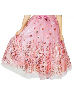 Rochia are top decorat cu paiete, fusta este din satin acoperit cu voal imprimat cu flori si frunze aurii, are si trandafiri decorativi in talie.