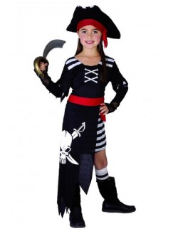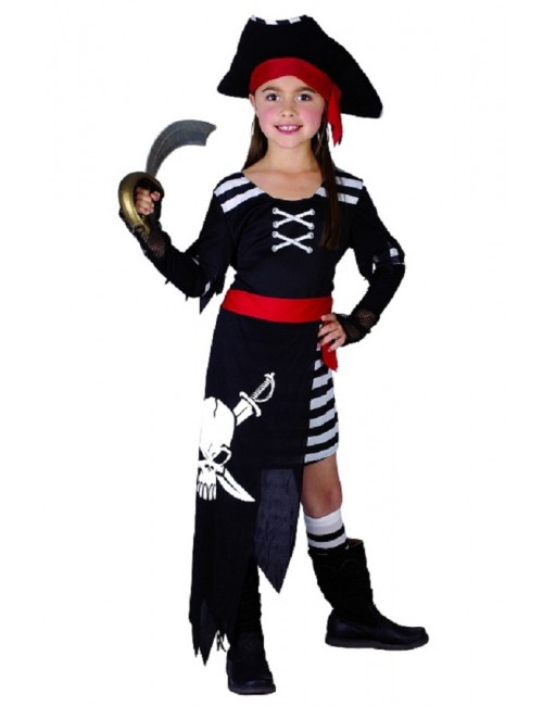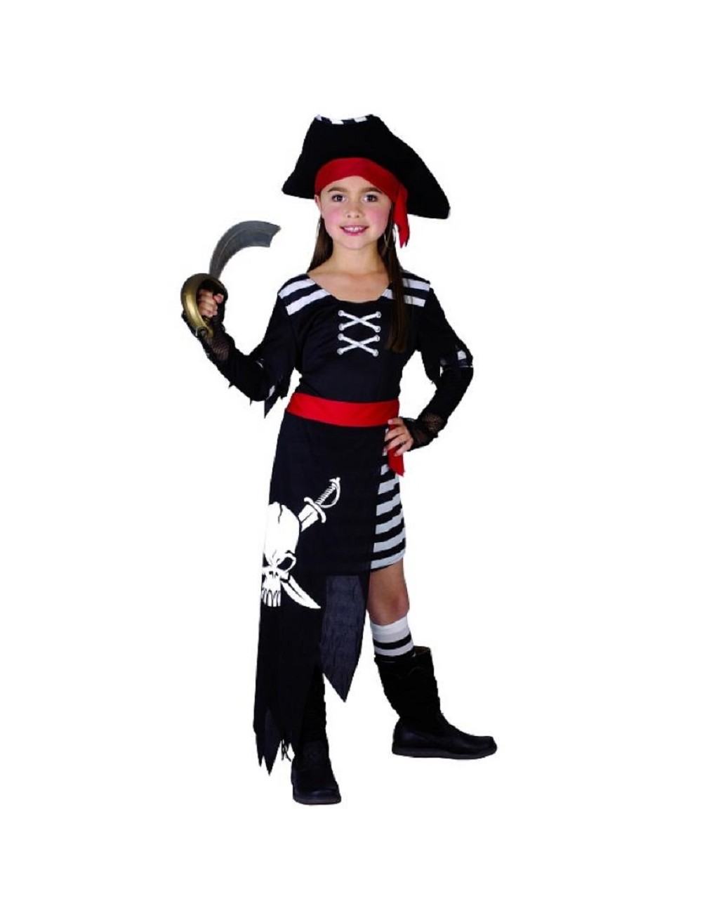 Costum Fetita Pirat, cu craniu, pentru copii, contine: palarie si rochie asimetrica, din lycra alb-negru, maneci detasabile si centura rosie, 100% poliester.