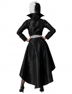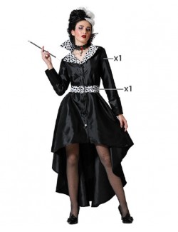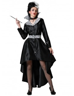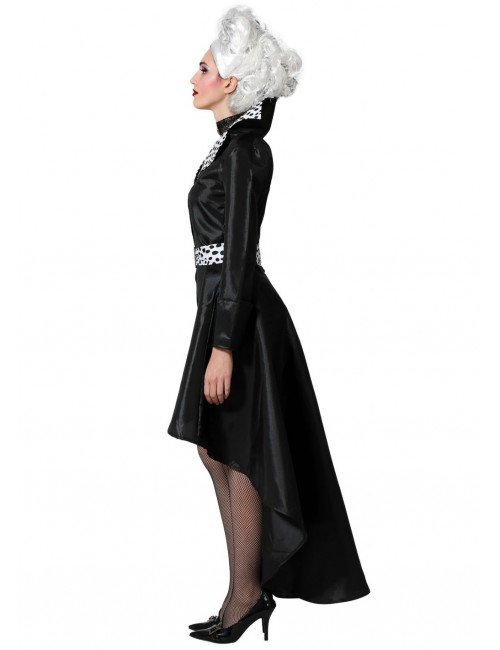 Costum Cruella de Vil pentru femei, XS-S, contine Rochie asimetrica din tafta neagra si o centura alba cu pete negre, 100% poliester.