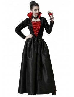 Rochie Femeie Vampir, marimi XS-XXL, cu maneci lungi si guler inalt, din tafta negru-rosu, inchidere cu fermoar lung pe spate, compozitie material 100% poliester.