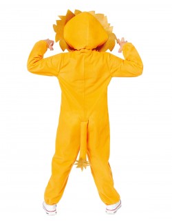 Costum unisex, Leu, pentru copii, include: salopeta din plus portocaliu, cu gluga cu forma unui cap de leu si coada detasabila, inchiderea cu fermoar.