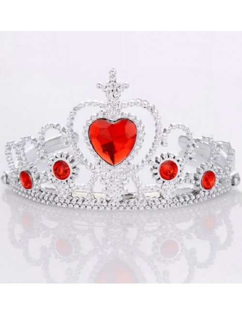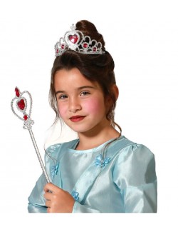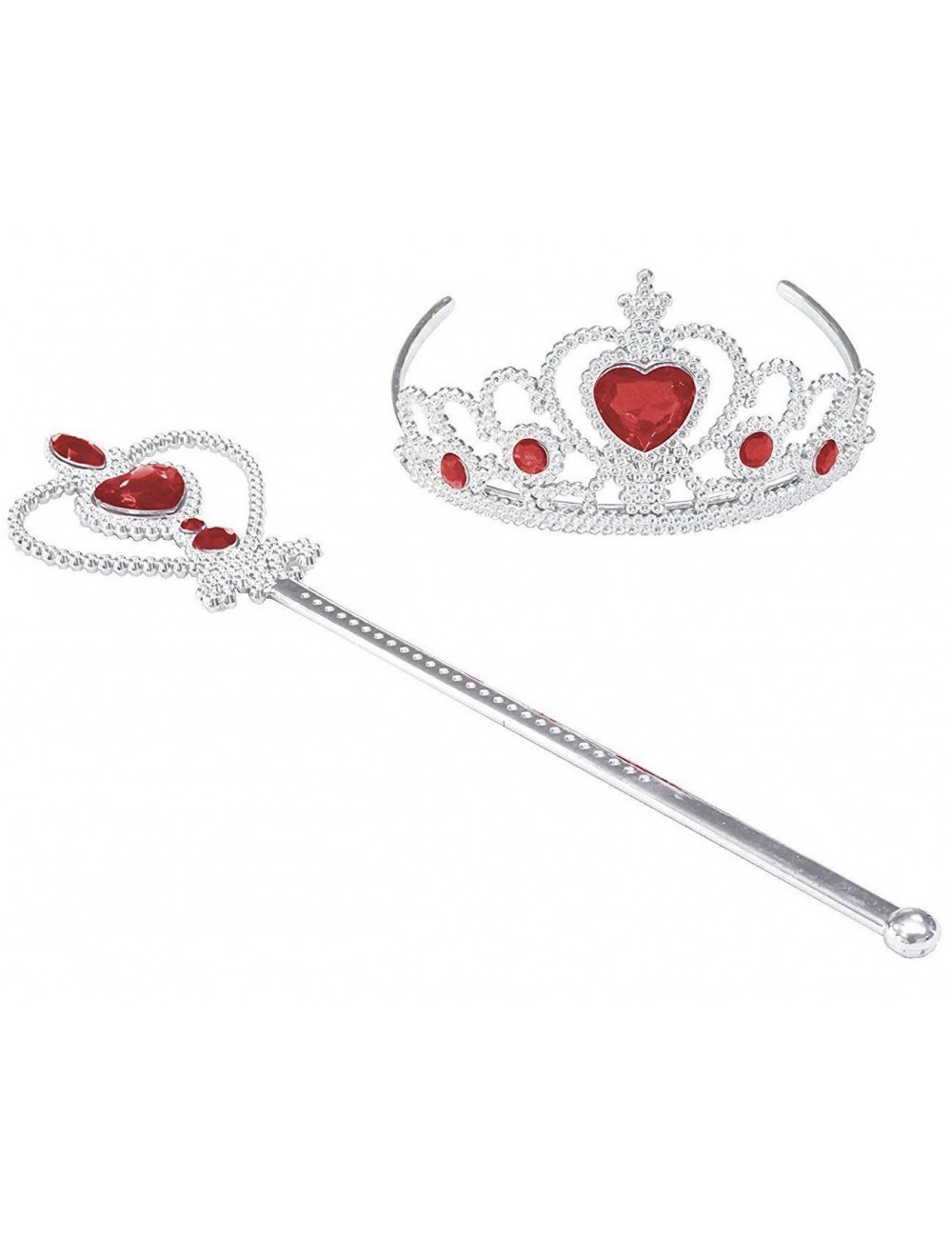 Set Diadema si bagheta argintii, din plastic, accesorizate cu pietre rosii in forma de inima sau rotunde, perfect pentru completarea tinutei de Printesa.