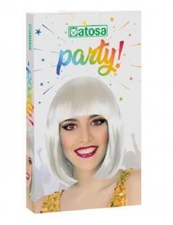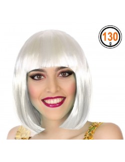 Peruca alba, cu par scurt si breton, fabricata din fire sintetice, greutate 130 grame.