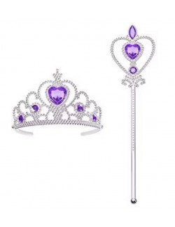 Set Diadema si bagheta argintii, din plastic, accesorizate cu pietre mov in forma de inima sau rotunde, perfect pentru completarea tinutei de Printesa.