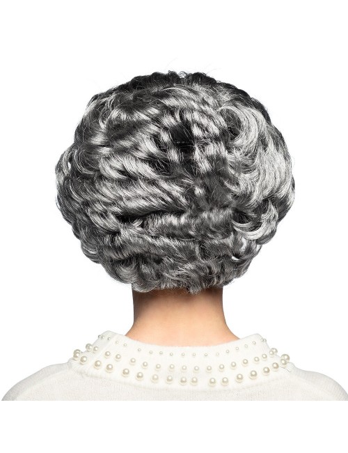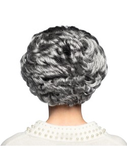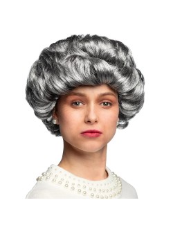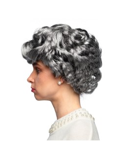 Peruca Bunicuta Elizabeth, pentru adulti, par scurt, grizonant, ondulat, fabricata din fire sintetice, poliester 100%.