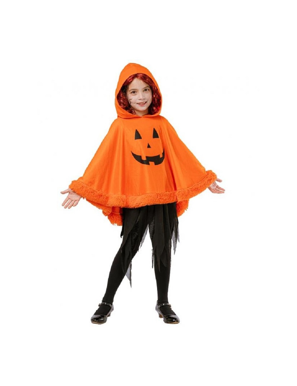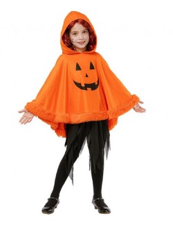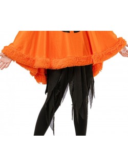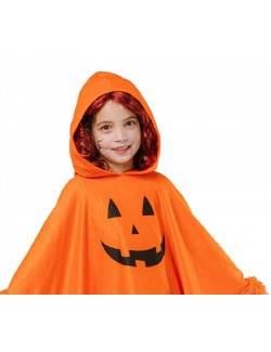 Poncho cu gluga Dovleac Halloween, pentru copii, culoare portocalie, din plus moale cu garnitura de blanita sintetica, poliester 100%, marime unica.