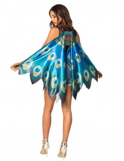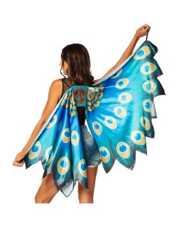 Aripi de Paun, prindere cu elastic dupa umeri si degete, din satin cu design detaliat cu pene de păun albastru, 100% poliester, dimensiuni 115 x 155 cm.