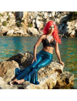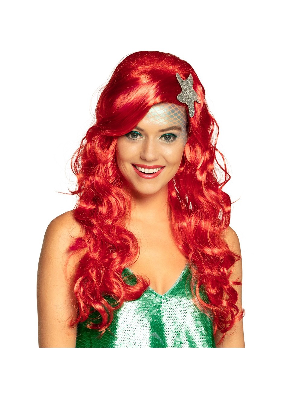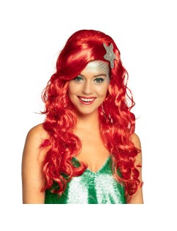 Peruca rosie Sirena cu stea de mare, pentru adulti, poliester 100%, fire sintetice de foarte buna calitate, este inspirata de Mica Sirena - Ariel.