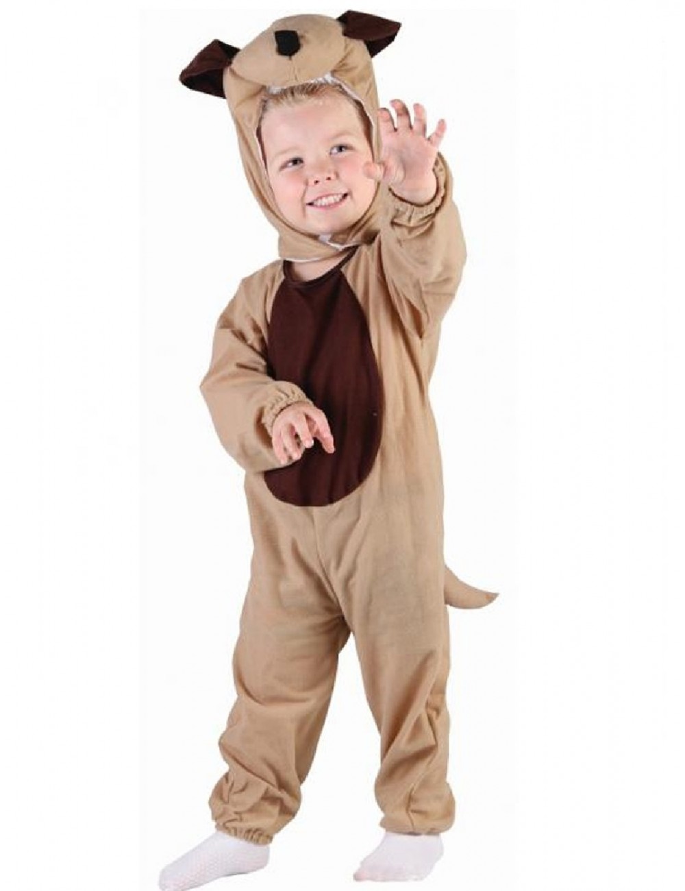 Costum Catel pentru copii, din plus subtire, culori bej-maro, contine salopeta (inchidere cu scai), coada si gluga detasabila, cu forma unui cap de catel.