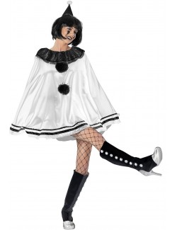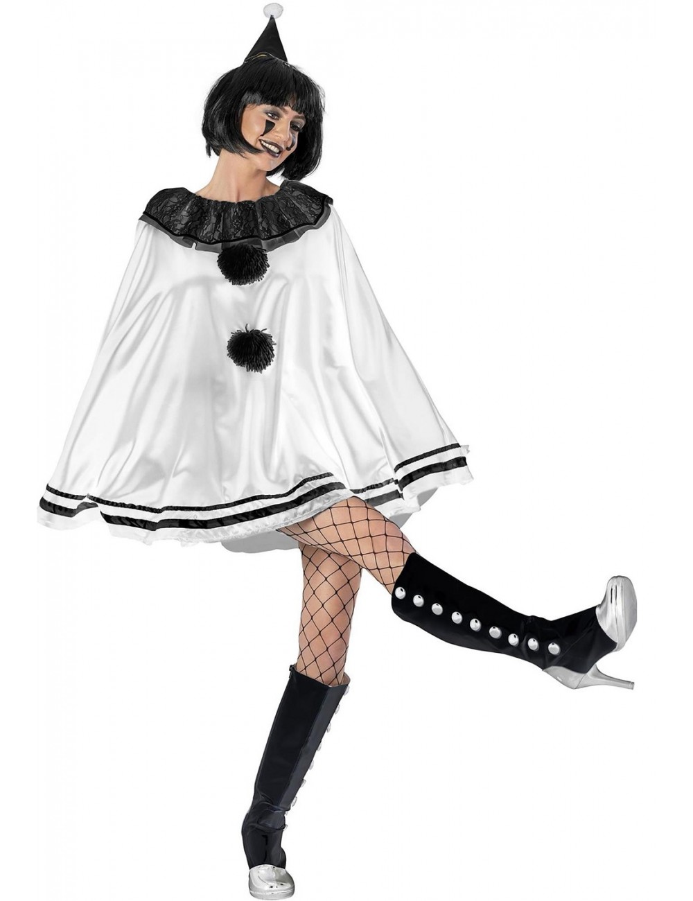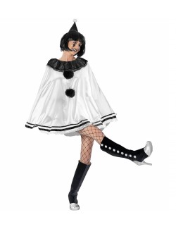 Poncho Arlechin - Pierrot, culoare alba cu guler si garnitura negre si o mini-palarie cu bentita, marime unica.