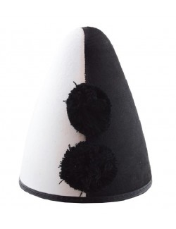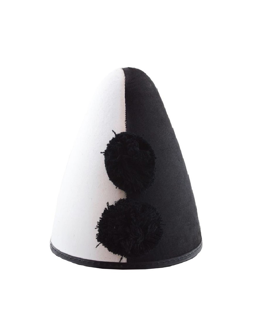 Palarie Pierrot / Arlechin, din fetru alb-negru, cu 2 pompoane negre, 100% poliester.