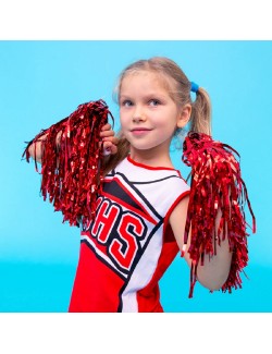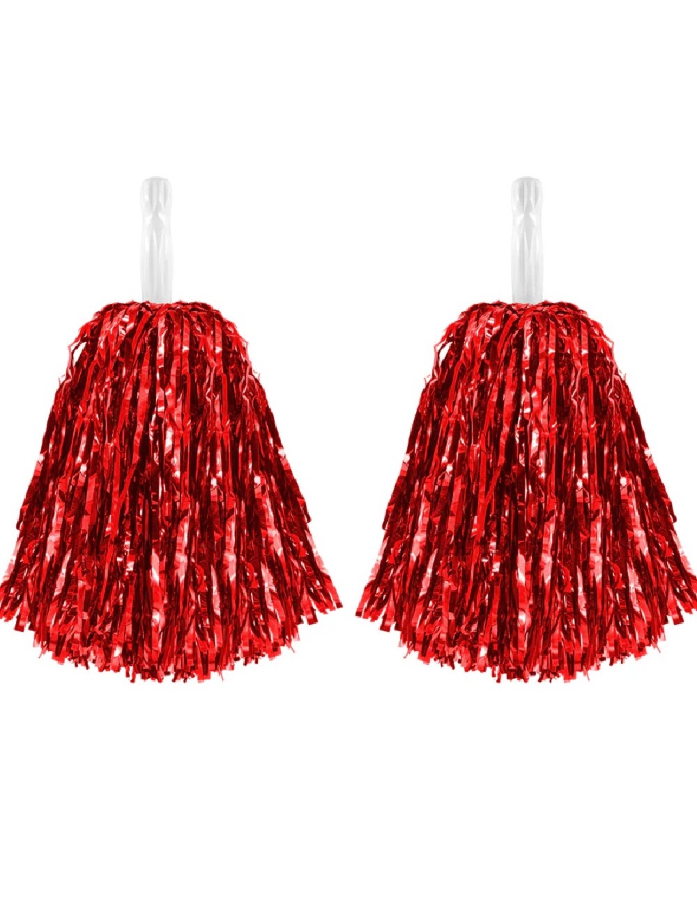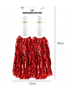 Set 2 Pompoane rosii, din folie metalica si mânere din PVC alb, pentru majorete sau alte activitati distractive.
