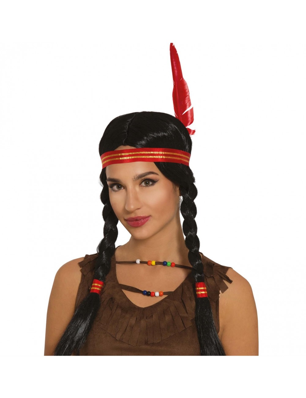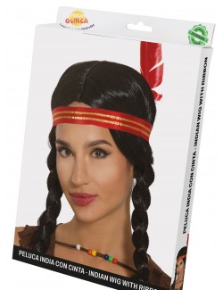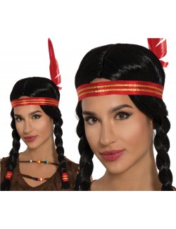 Peruca bruneta cu cozi impletite, de Indianca, accesorizata cu bentita si pana rosie, fabricata din fire sintetice, 100% poliester.