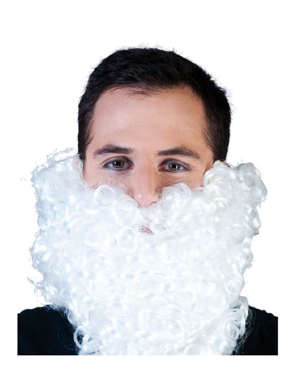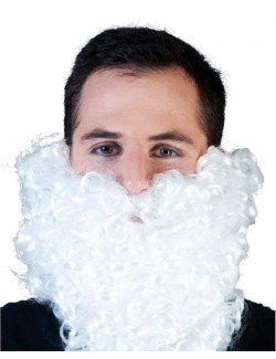Barba alba, ondulata, care se prinde cu elastic de urechi, lungime aprox. 27 cm, fire sintetice, 100% poliester, potrivita pebtru costumatia de Pitic, Spiridus, Mos Craciun, Rege Mag etc.