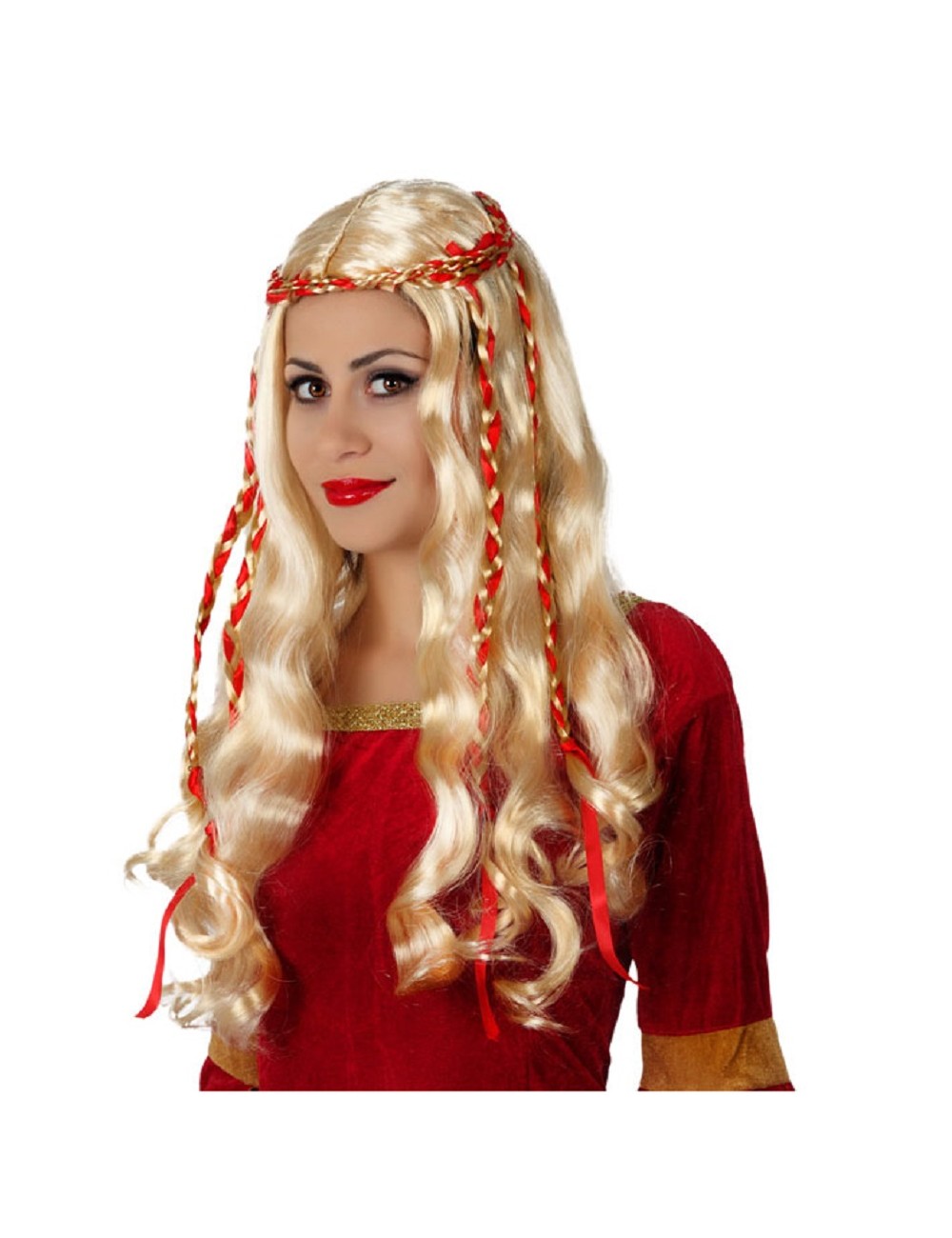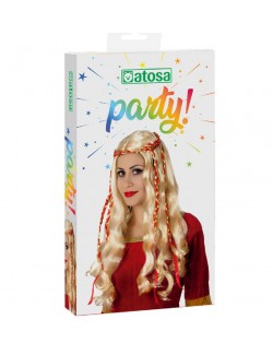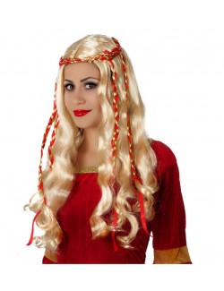 Peruca blonda cu codite impletite, adulti, par lung, ondulat, fabricata din fire sintetice, poliester 100%, perfecta pentru un costum renascentist / medieval.