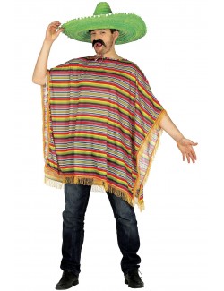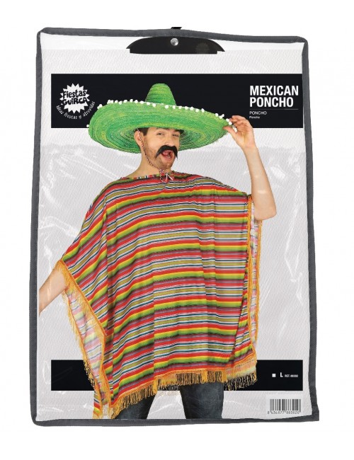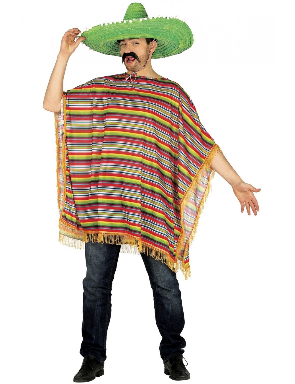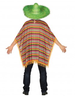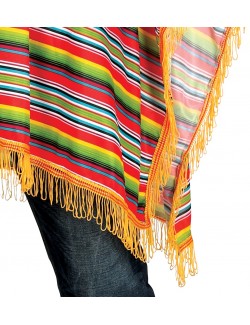 Poncho Mexican pentru adulti, din lycra, cu dungi multicolore si franjuri galbene, 100% poliester.