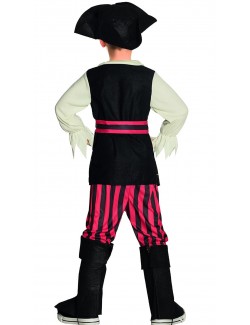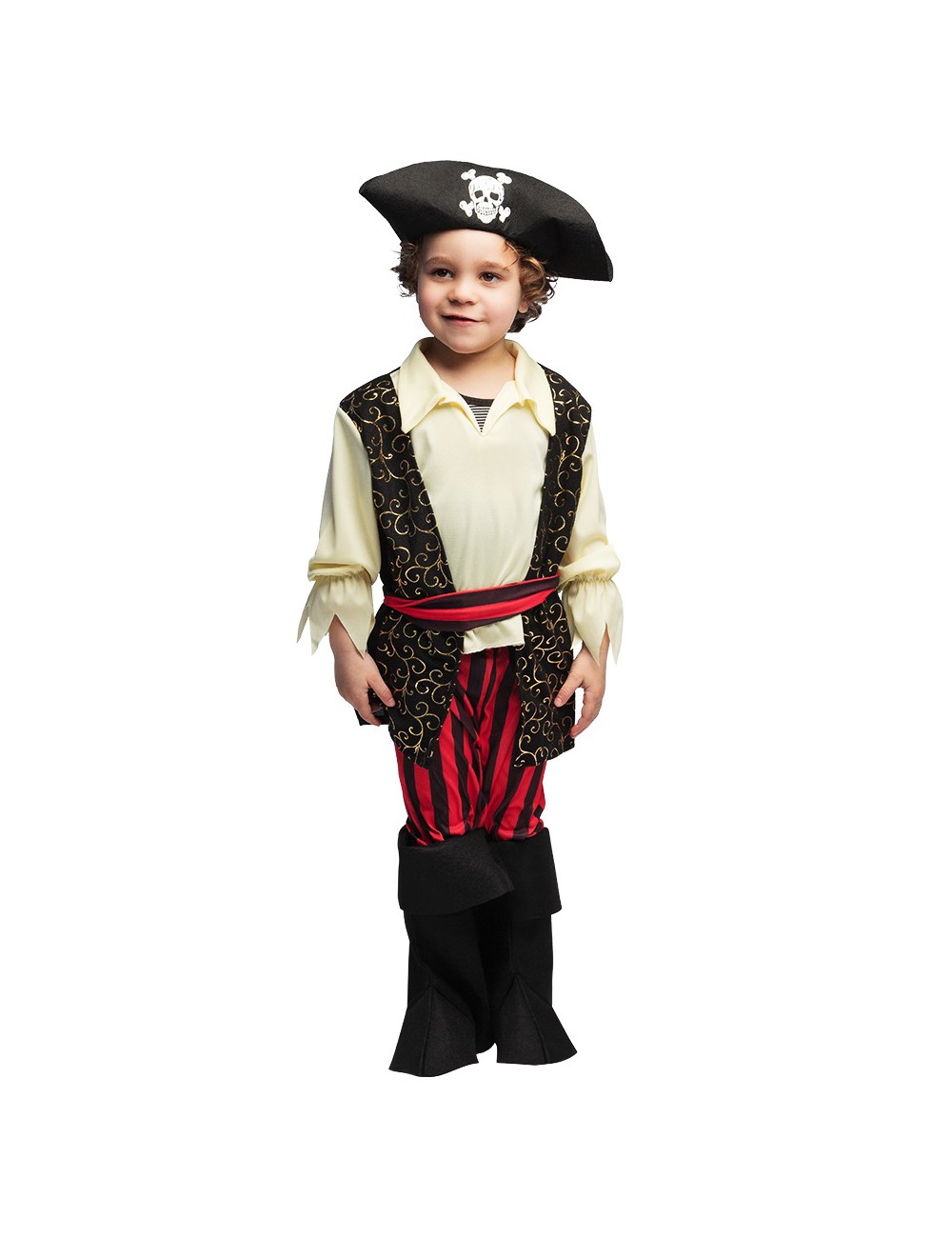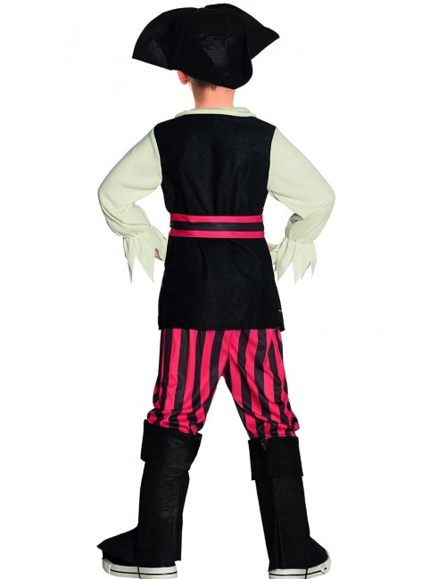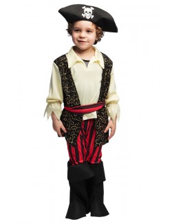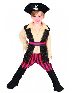 Costum Pirat Rocco pentru copii de 3-5 ani include: camasa cu vesta atasata, centura, palarie, pantaloni pana la genunchi si acoperitoare incaltaminte, material de calitate, 100% poliester.