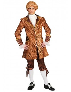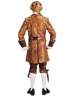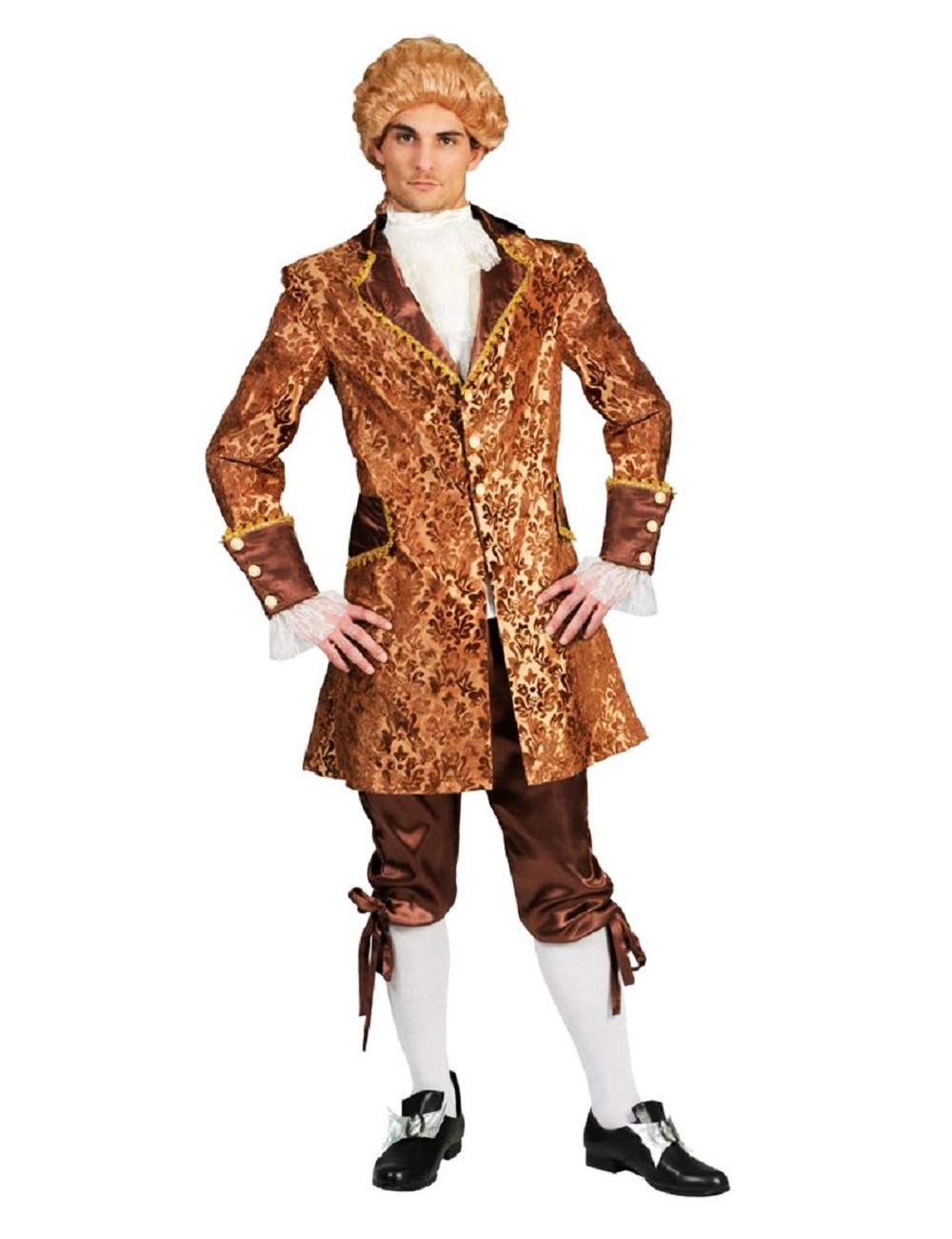 Costum baroc adulti, Marchiz Bartoli, contine: Jacheta lunga si pantaloni din satin, pana la genunchi, poliester 100%, culoare maro-coniac.