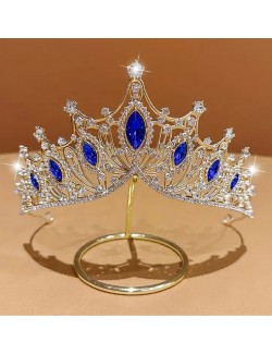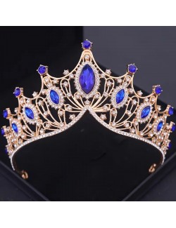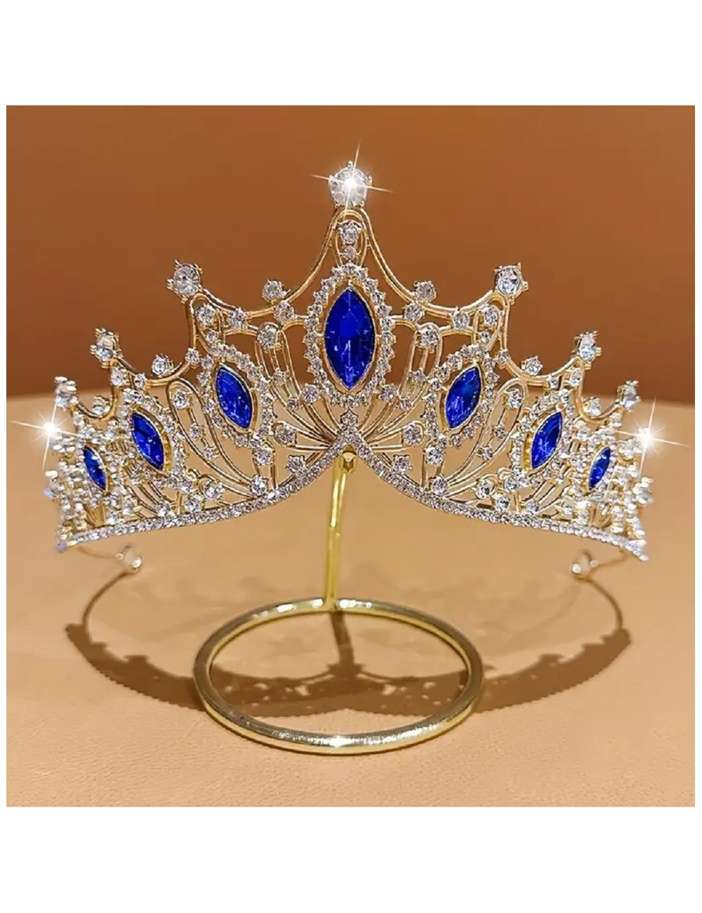 Diadema aurie cu Strasuri si Pietre albastre, din metal auriu ornamentat cu pietre albastre si strasuri alb-argintii, accesoriu pentru costumatia de regina, prințesă sau zână sau pentru a adăuga o notă regală unei ținute de nuntă.