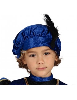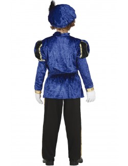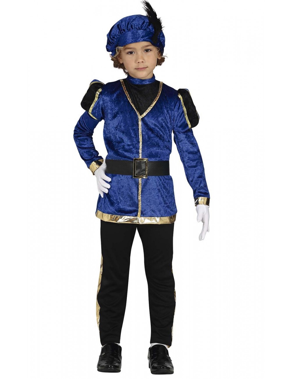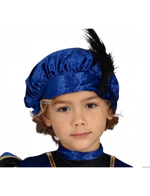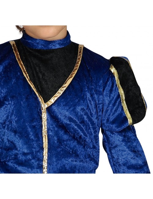 Costum Paj albastru, pentru copii, include: bluza cu maneca lunga, din catifea albastra, centura atasata, pantaloni din lycra neagra si palarie cu pana, accesorizat cu banda aurie.