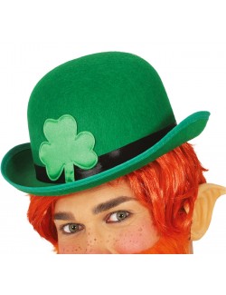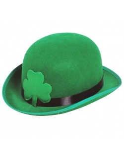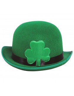 Palarie tip melon, are un trifoi cu 3 foi din satin, aplicat frontal, culoare verde, material ferm si rezistent, 100% poliester, circumferinta: aprox 60 cm.
