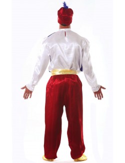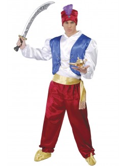 Costum Print arab / Aladin, pentru adulti, marimi S(46-48), M(48-50), include: bluza alba cu vesta albastra atasata, turban cu pana si piatra mare, pantaloni tip salvari si un brau galben, confectionate din satin (100% poliester).