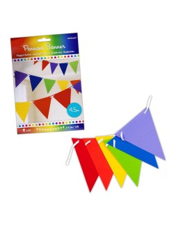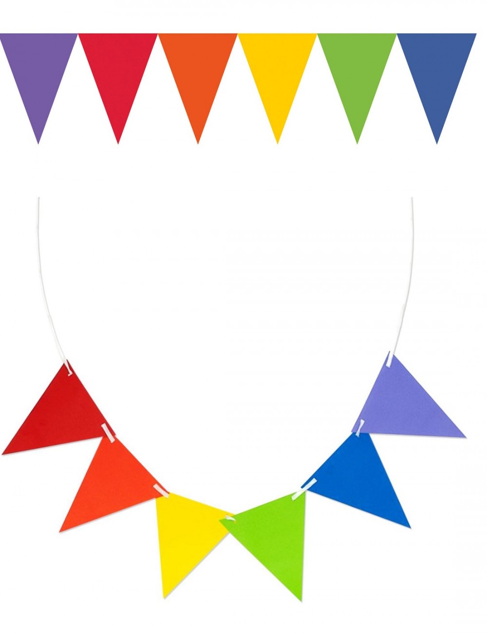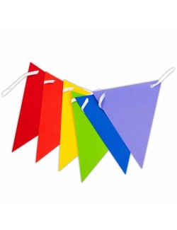 Ghirlanda party, Curcubeu, 457 x 17,7 cm, alcatuita dintr-o serie de fanioane din hartie colorata, fiecare cu inaltime de 17,7 cm si lungime totala de 457 cm.