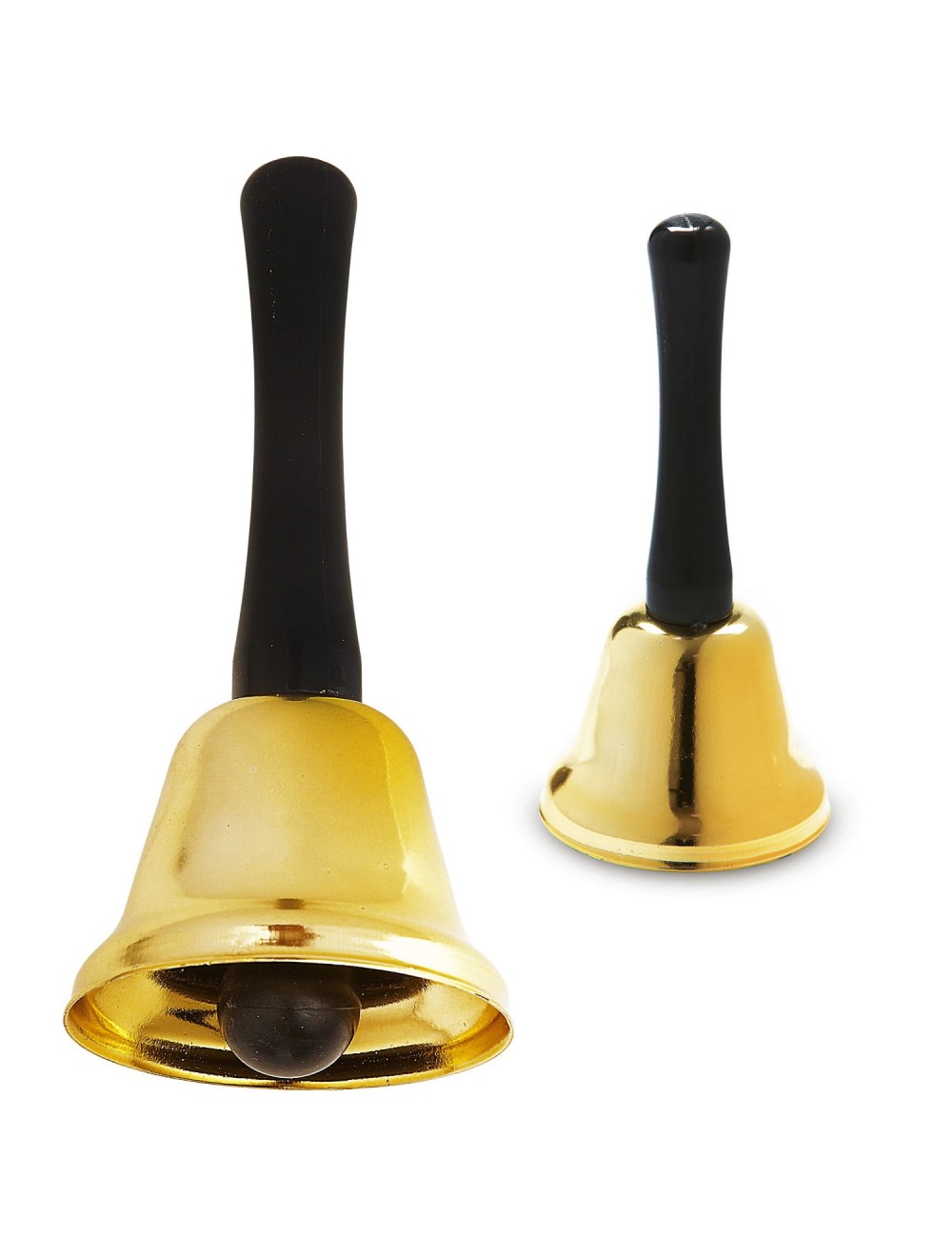 Clopotel Mos Craciun, auriu cu maner din plastic negru, lungime 12,5 cm, accesoriu pentru petrecerea de Craciun.