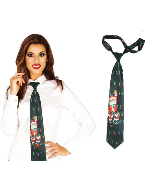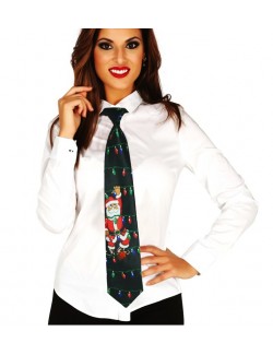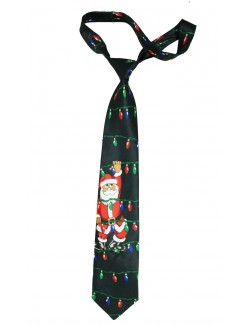 Cravata muzicala Mos Craciun, confectionata dintr-un material fin, satinat, poliester 100%, culoare neagra cu imprimeu multicolor.