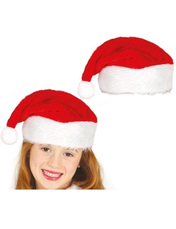 Caciula Mos Craciun / Craciunita pentru copii, lungime 34 cm, confectionata din plus rosu, cu garnitura din blanita sintetica alba si un mot alb, 100% poliester.