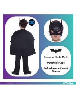 Costum copii, Batman Dark Knight, include: salopeta din lycra imprimata, cu muschi din EVA pe piept, umeri captusiti cu vatelina, masca din plastic si mantie. Inchiderea se face la spate cu benzi de scai.