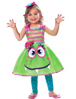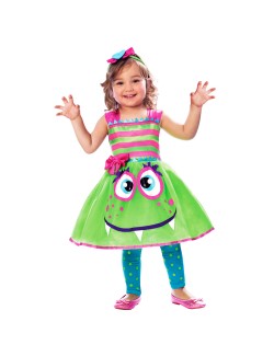 Costum carnaval, Monstru vesel, copii 3-4 ani, contine o bentita cu aplicatii si o rochie multicolora, fara maneci, confectionata din satin, lycra si tul. Prevazuta cu elastic in talie si jupa pentru volum.