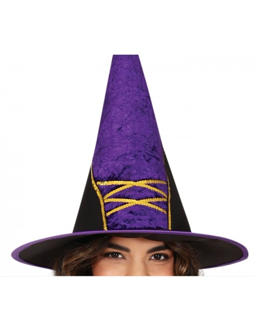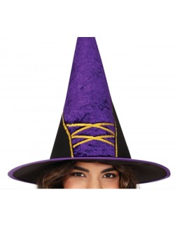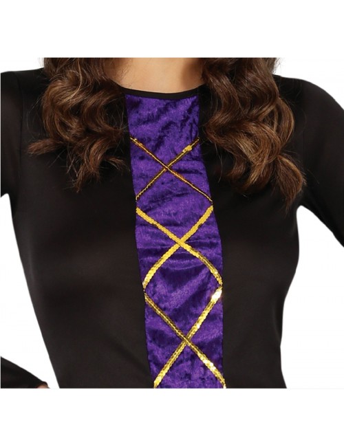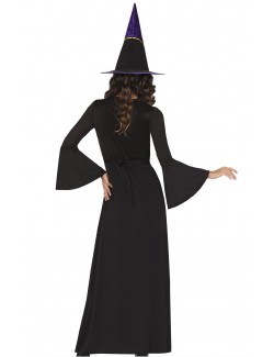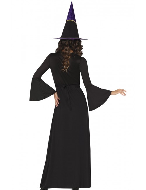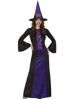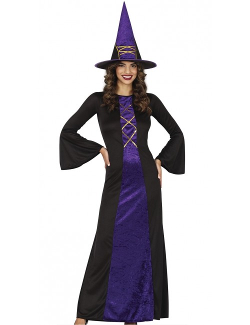 Costum femei, Vrajitoare negru-mov, contine: Rochie lunga, cu cordon in talie si palarie, culori negru (lycra) si mov (catifea), ambele cu garnitura aurie, 100% poliester.