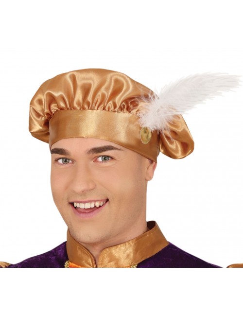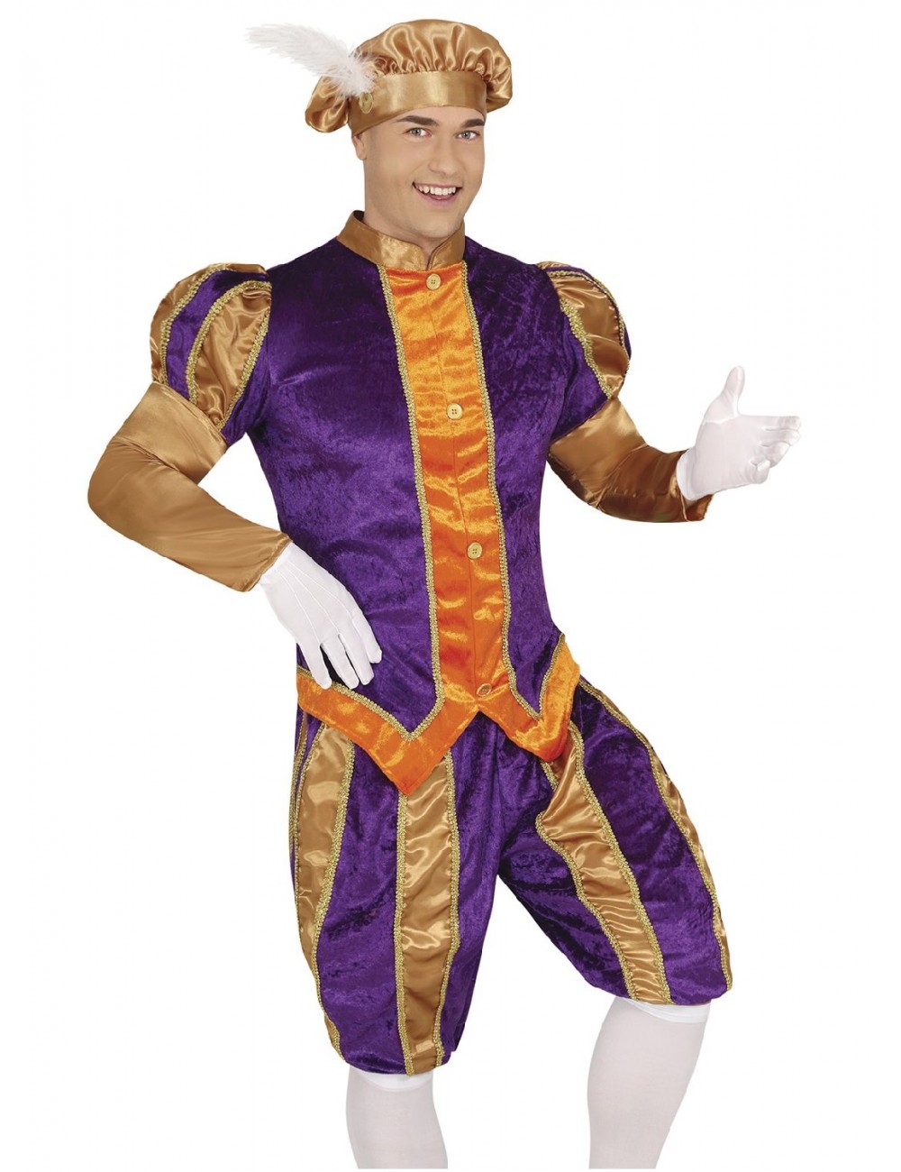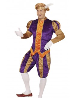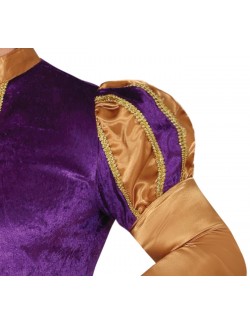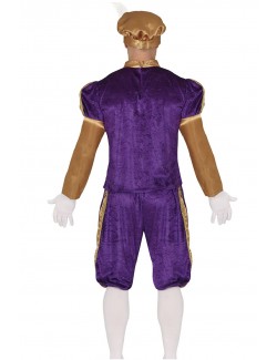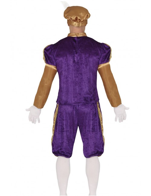 Costum Paj - Purple page, mov-auriu, include: bluza cu maneca lunga, inchidere cu nasturi, pantaloni pana la genunchi si palarie cu pana, accesorizat cu banda aurie.