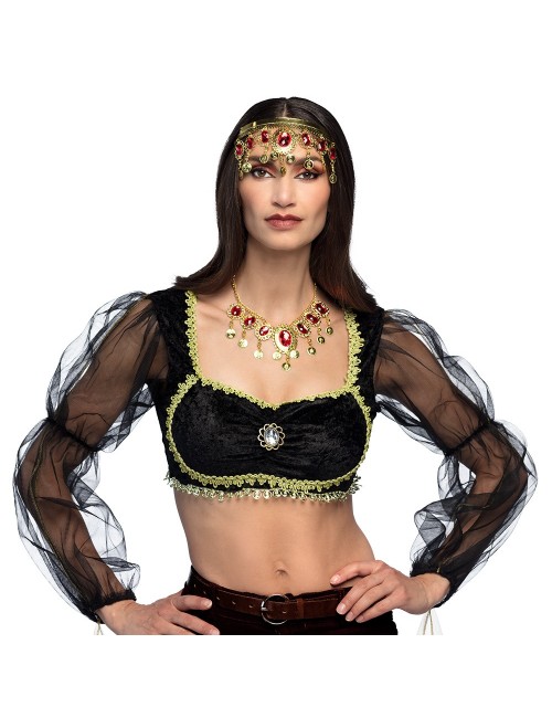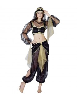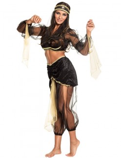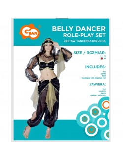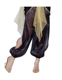Costum Belly dancer pentru femei, marimi S si M, contine: Bustiera, Pantaloni din tul negru, esarfa din catifea pentru solduri si accesoriu pentru cap, 100% poliester.