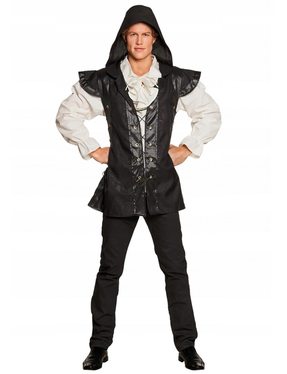 Costum Tâlhar din padure, Hooded Ranger, pentru barbati, include: jacheta neagra cu gluga si camașă alba.
