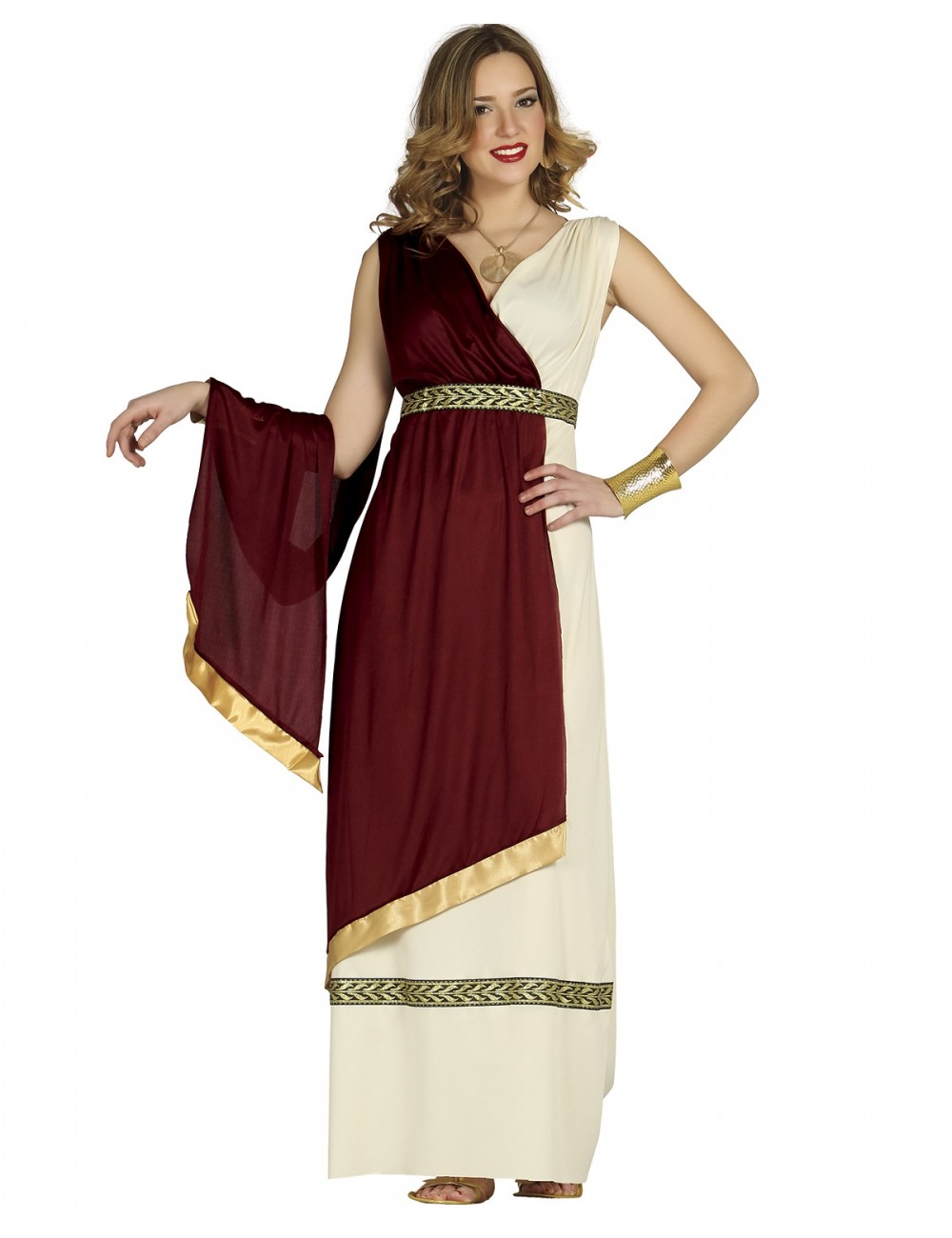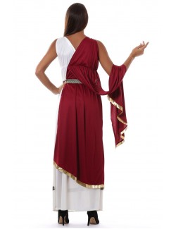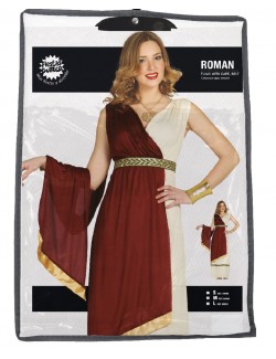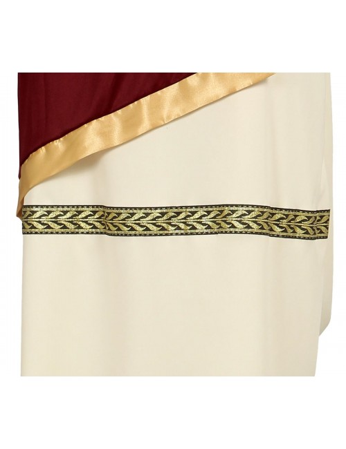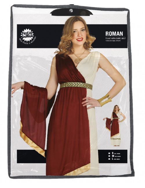 Costum Femeie Romana, M-L, contine: tunica alba cu esarfa grena atasata si cordon. Rochia atre talie inalta, este din lycra, 100% poliester.