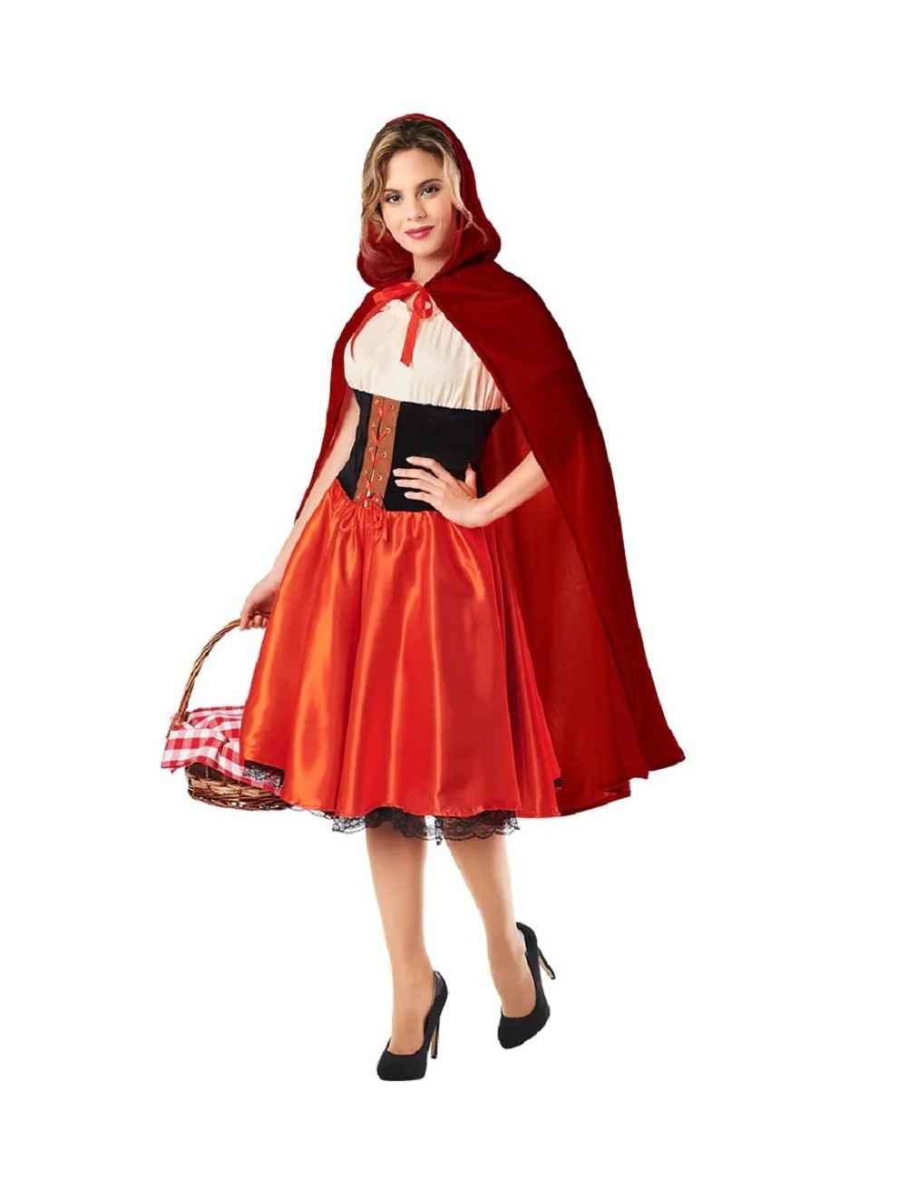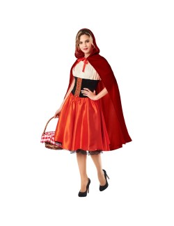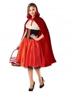 Costum elegant Scufita Rosie, include o frumoasă rochie roșie cu corset si jupon cu dantelă și o pelerină din catifea roșie cu gluga.