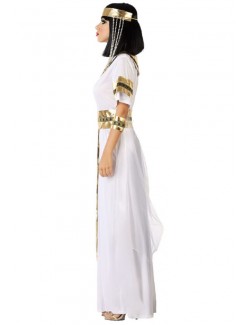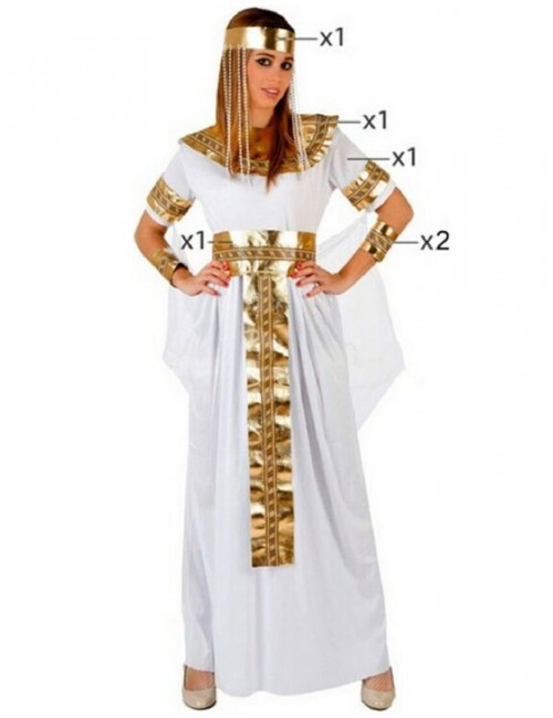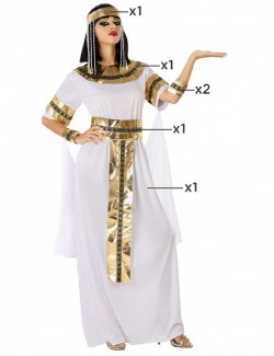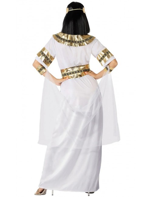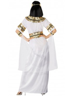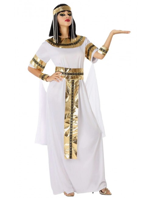 Costum Regina egiptean pentru femei, alcătuit din: Rochie din lycra alba, guler auriu, centura, accesorii pentru brate si bentita pentru cap. Material 100% poliester.
