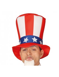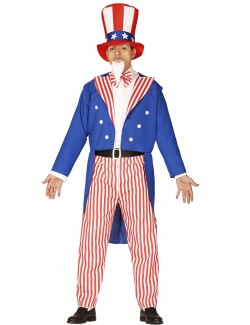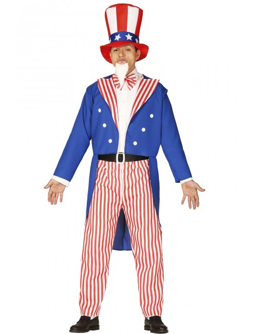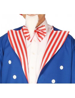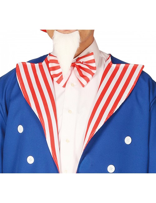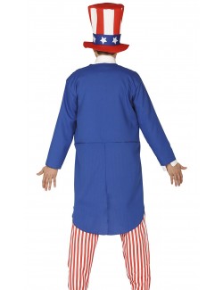 Costum american Uncle Sam, pentru barbati, contine jacheta albastra, pieptul unei camasi albe, pantaloni cu dungi alb-rosii, papion, centura neagra si palarie inalta, material 100% poliester.