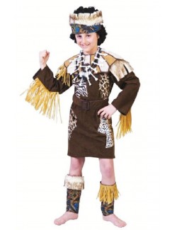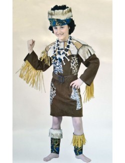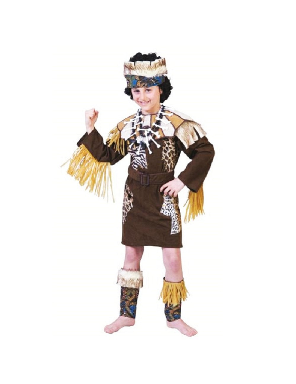 Costum Print african, pentru copii, contine: tunica maro cu franjuri bej la maneci, accesorii pentru cap si picioare si o centura, 100% poliester, inchidere cu fermoar lung pe spate.