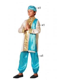 Costum traditional baiat indian, contine: Tunica, pantaloni si accesoriu pentru cap, din satin culori bleu-crem cu garnitura aurie, 100% poliester.