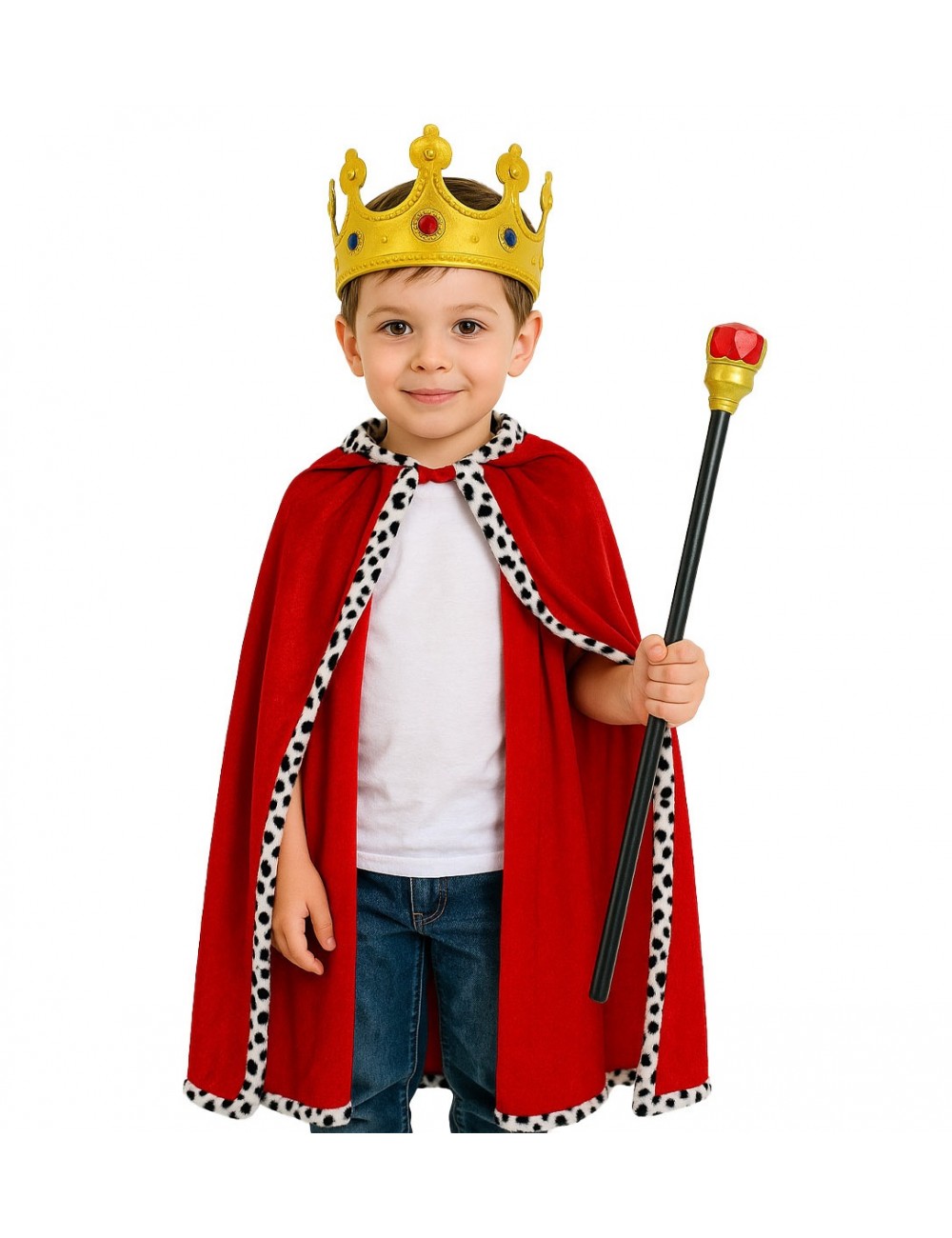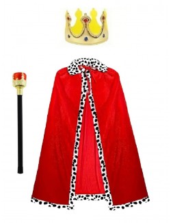 Set Rege: Sceptru, Coroana si Mantie rosie cu lungime de 72 cm, din plus rosu cu guler si garnitura cu imprimeu tip dalmatian, 100% poliester.