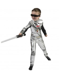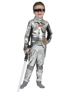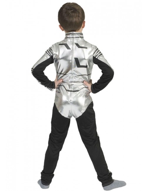 Costum Calator spatial pentru copii, include: salopeta din material argintiu si lycra neagra, inchiderea seface cu fermoar lung pe spate, 100% poliester.
